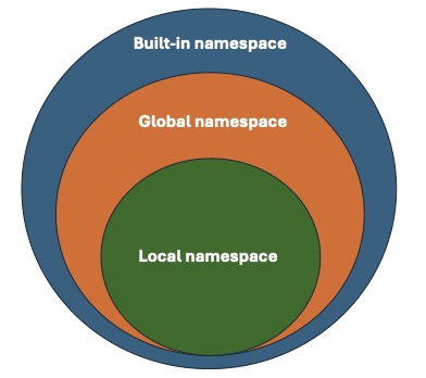 You can think of a namespace as a mapping from names to objects, and scope as the textual region in the script where the namespace is accessible. We differentiate between built-in namespaces, which include words such as for, in, and while; global namespaces, which cover the entire script along with the variables and functions you create within it; and local namespaces, which encompass variables (or functions) defined within functions.
