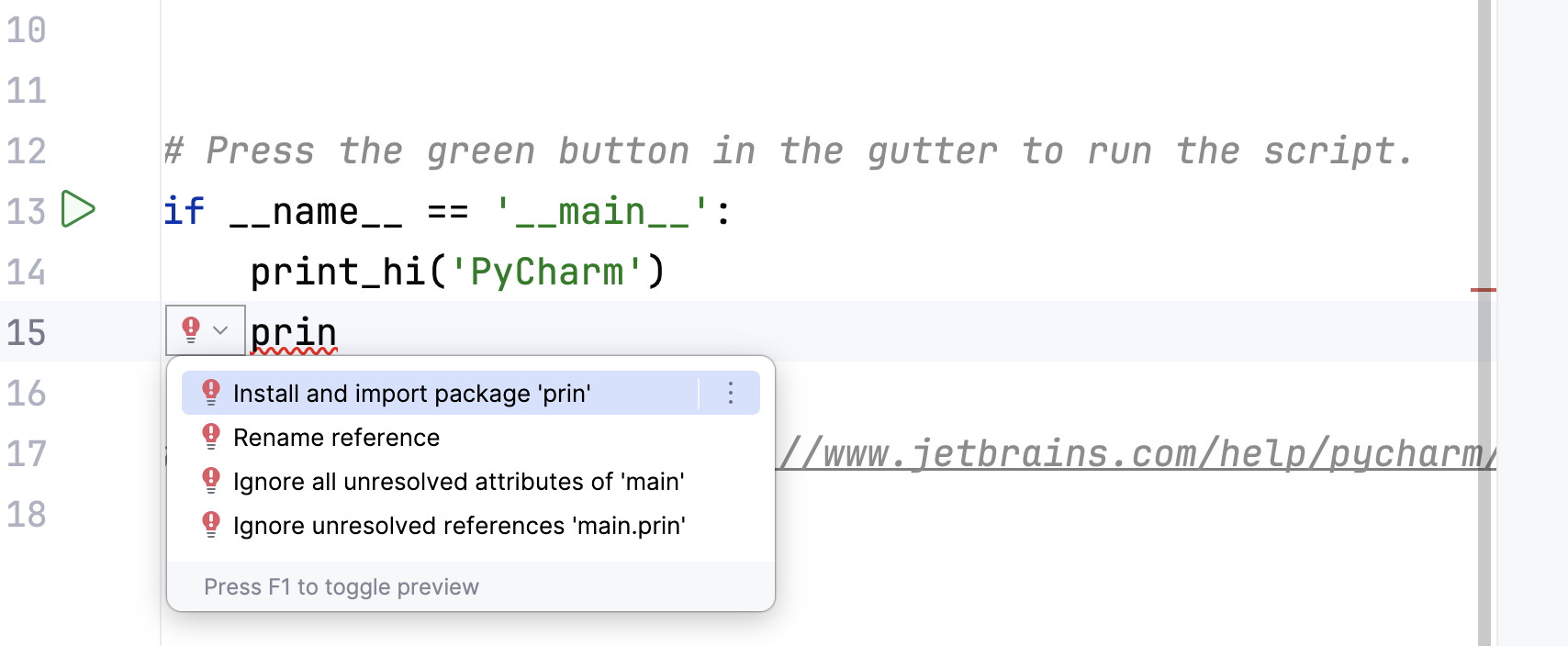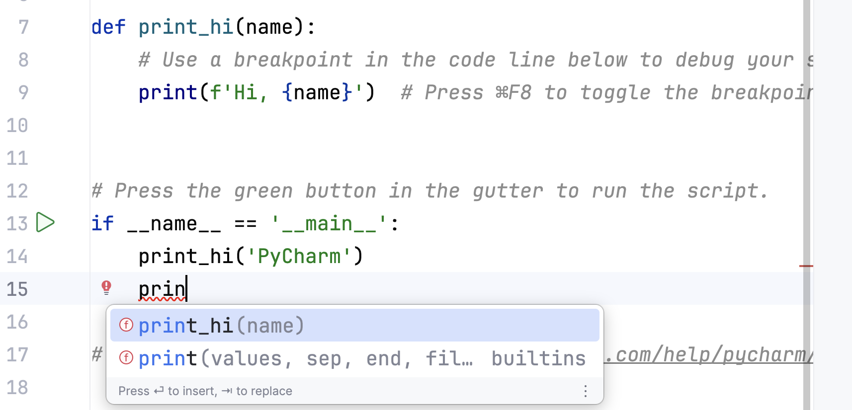 PyCharm can give you various tips while you program. These suggestions and/or tips will be shown together with a light bulb.