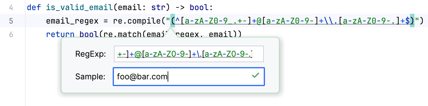 If you work with regular expressions, PyCharm can help you check whether your string matches your expression. To do that, you can click Option (or Alt) and Enter when your mouse is above the regular expression.