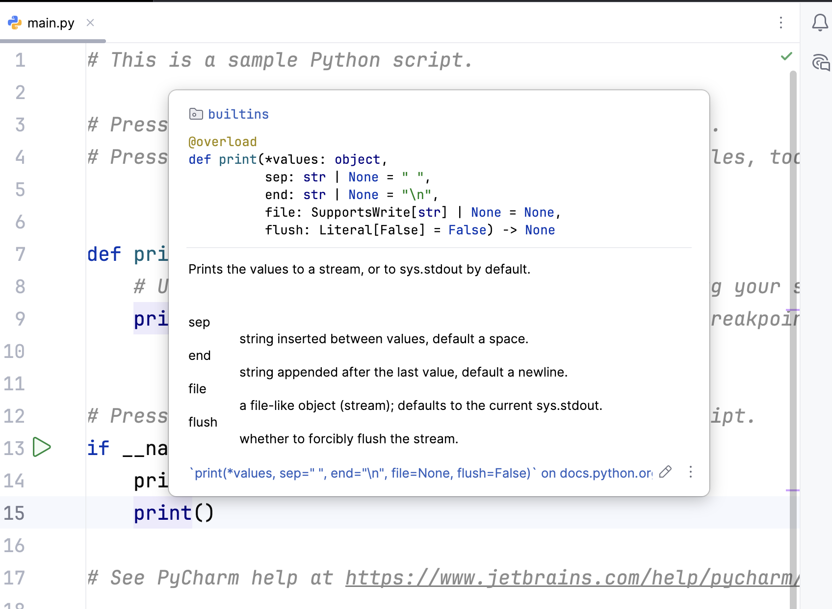 If you want to look up certain functions, you can press F1 (or Ctrl + Q) while your mouse is on the function name. PyCharm will give you an insight into the documentation then.