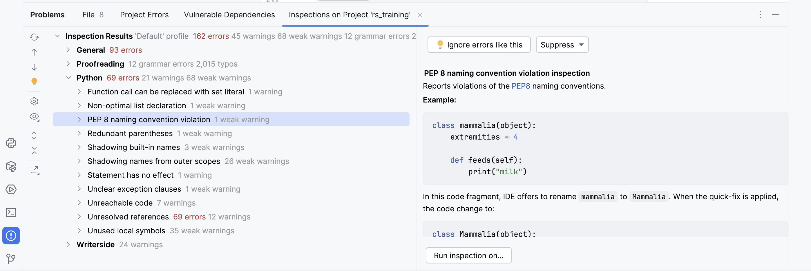 After clicking on the corresponding item, PyCharm will suggest you possible changes or improvements.