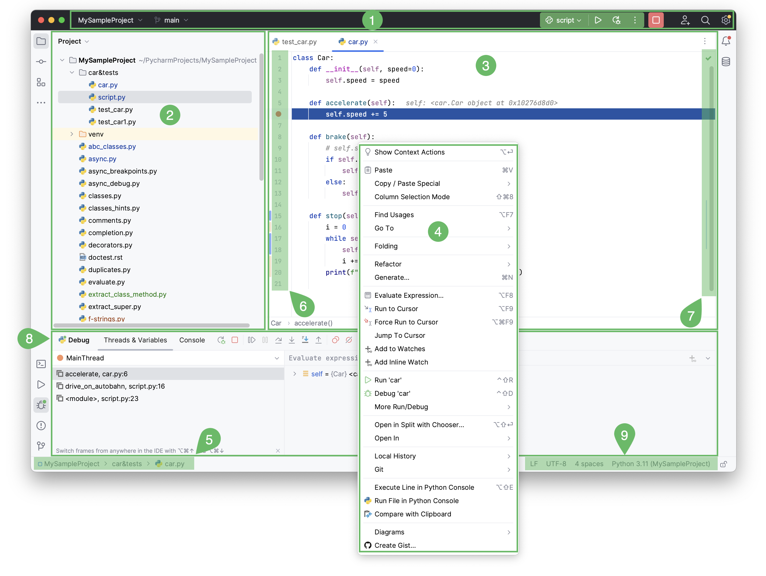 The interface of PyCharm shows you nine different elements.