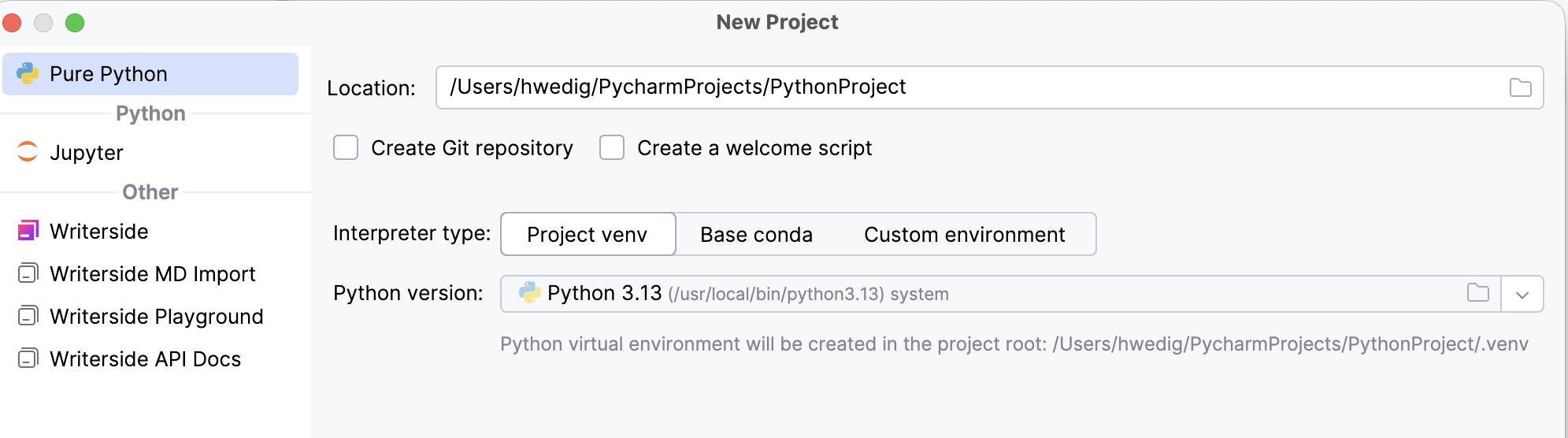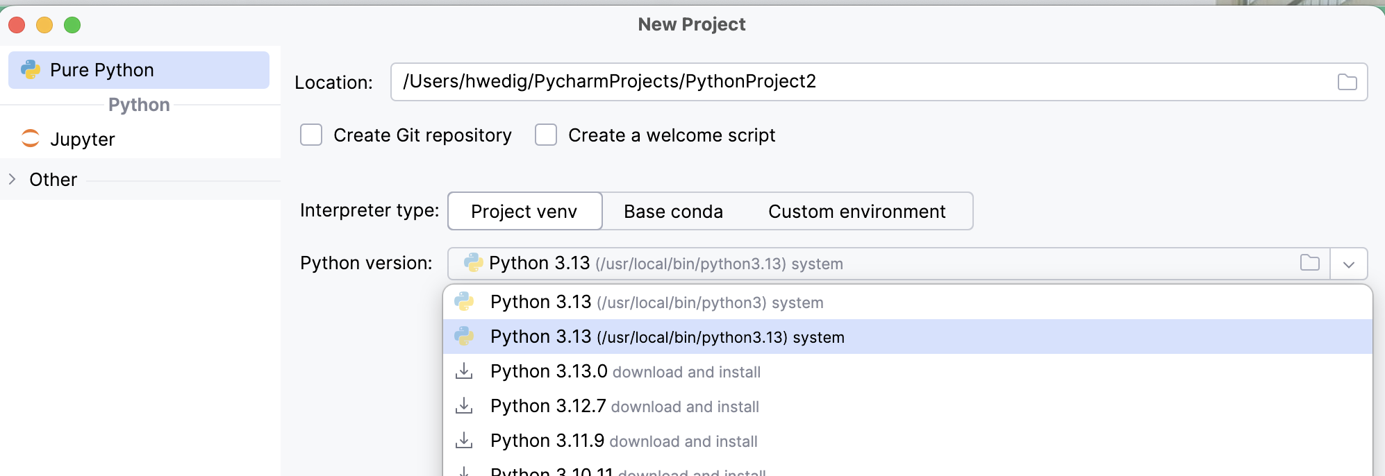 To create a project, you click on File > New Project then choose Pure Python and your project location. Afterward, you can select the Python version to work with and decide whether to set up a Git repository.