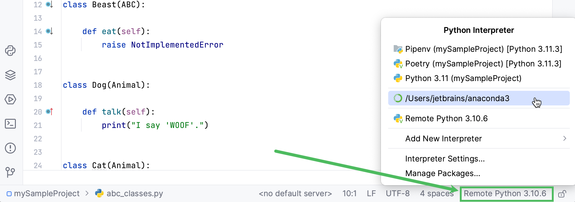 - The status bar (9) shows you the file formatting, some warnings and the virtual environment that you are in.