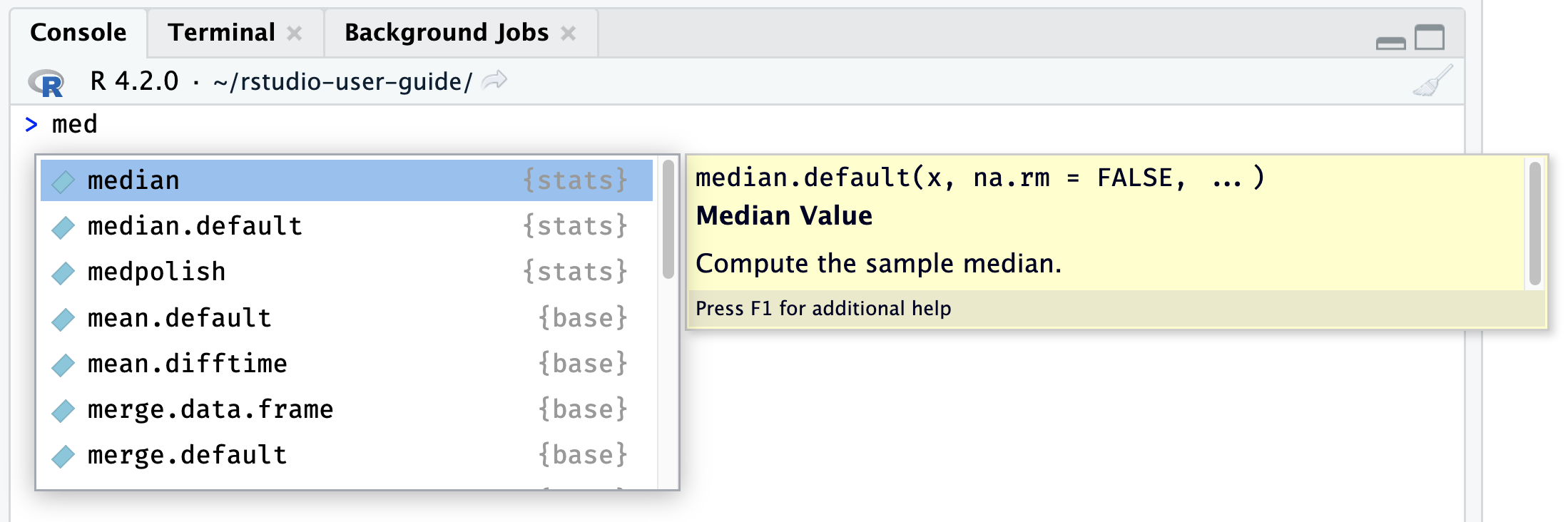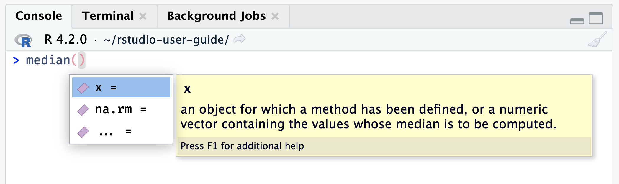 RStudio can help you with writing your code by offering automatic completion using the Tab key. It automatically completes object names, function names and even possible arguments.