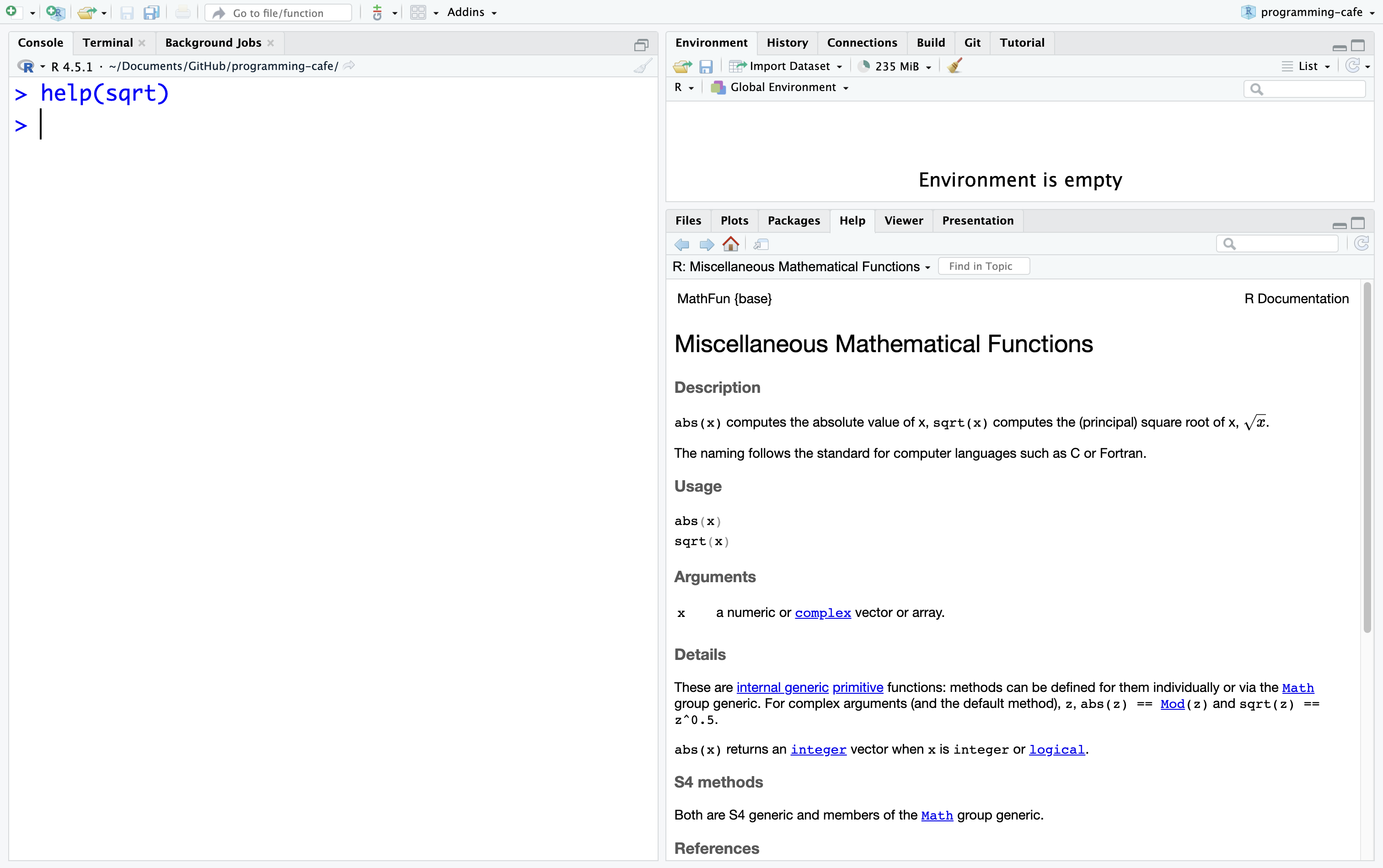 In the following screenshot you can see the documentation of the sqrt()function: