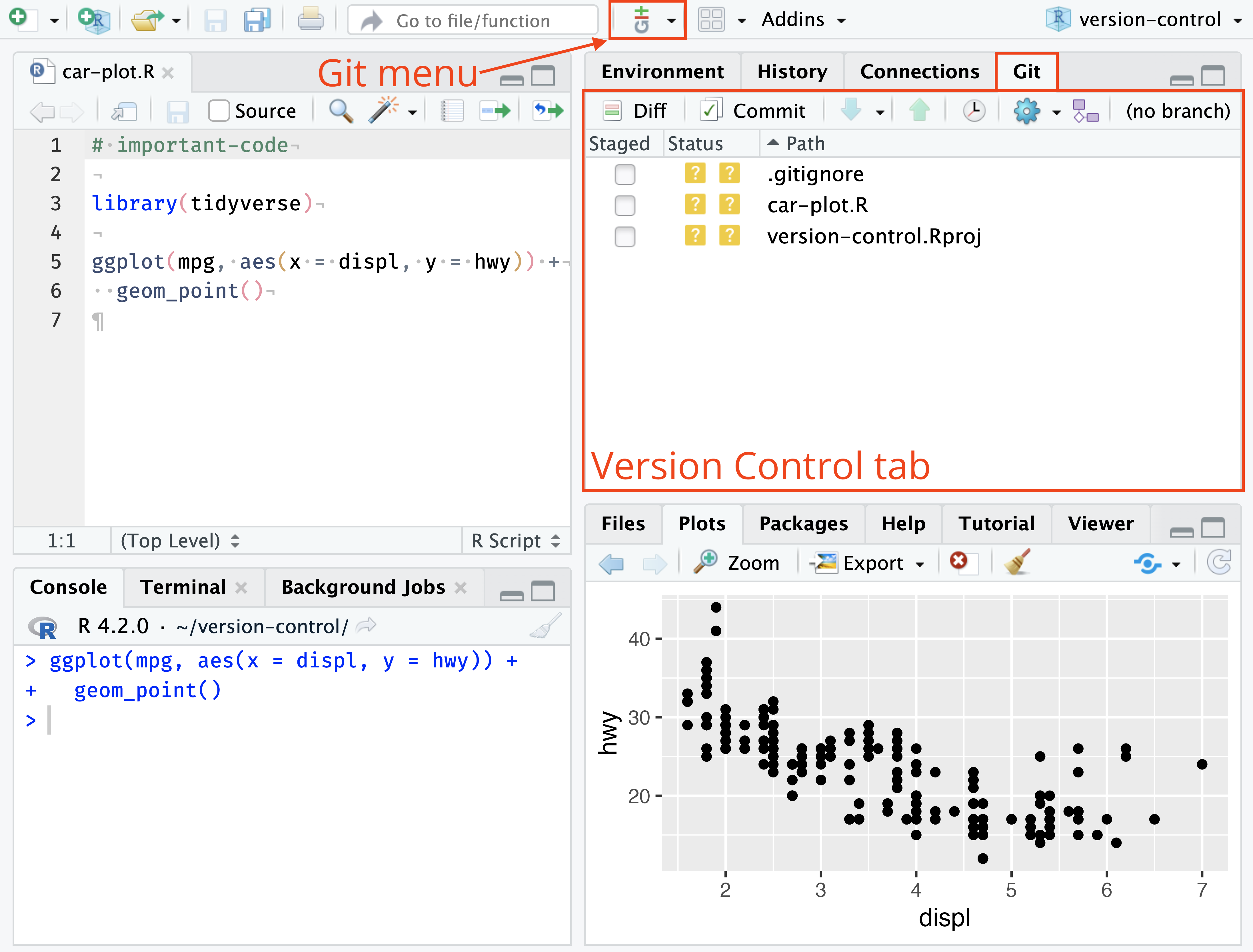 It is possible to connect R Studio with Git and Subversion. To do that, you can go to Settings > GIT/SVN and then enable the version control. Once you enabled it, you will find the Git tab in the Environment pane which shows you the current changes. It also allows you to commit, push and pull using the Git dropdown.