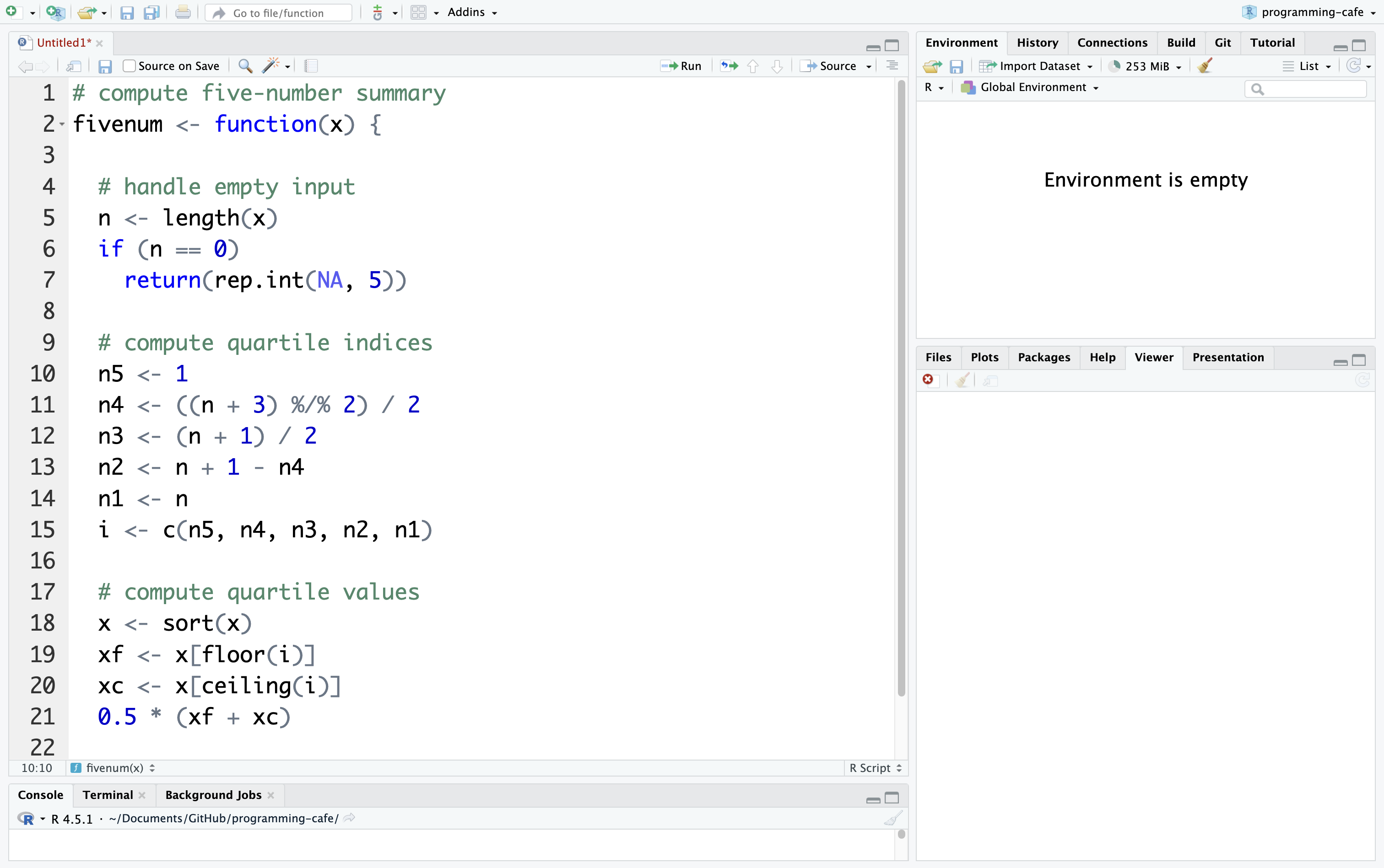 While writing your own code, R highlights important expressions in blue and comments in green. It also helps you manage your indentation, such as when writing a function. The following screenshot provides an example: