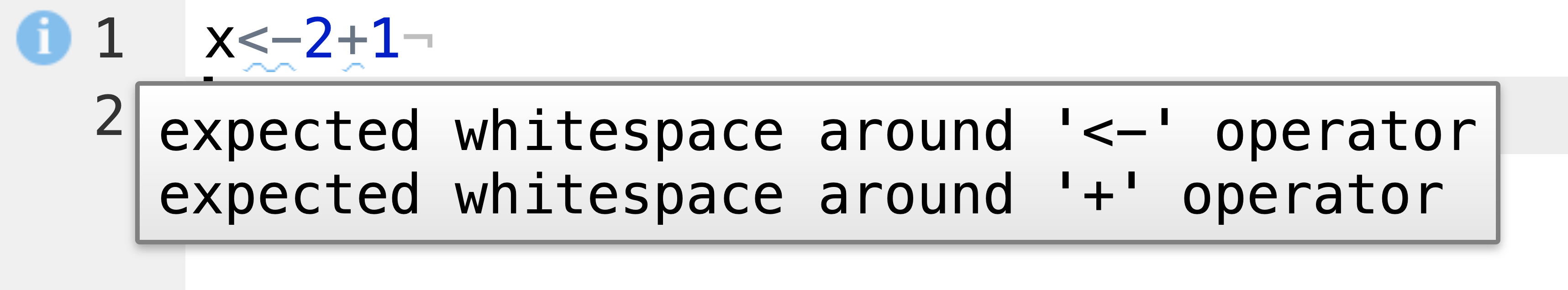 Turning the diagnostics on, you will see the potential problems. The screenshot below shows an example of a stylistic issue. R Studio offers a good overview of all potential messages here.