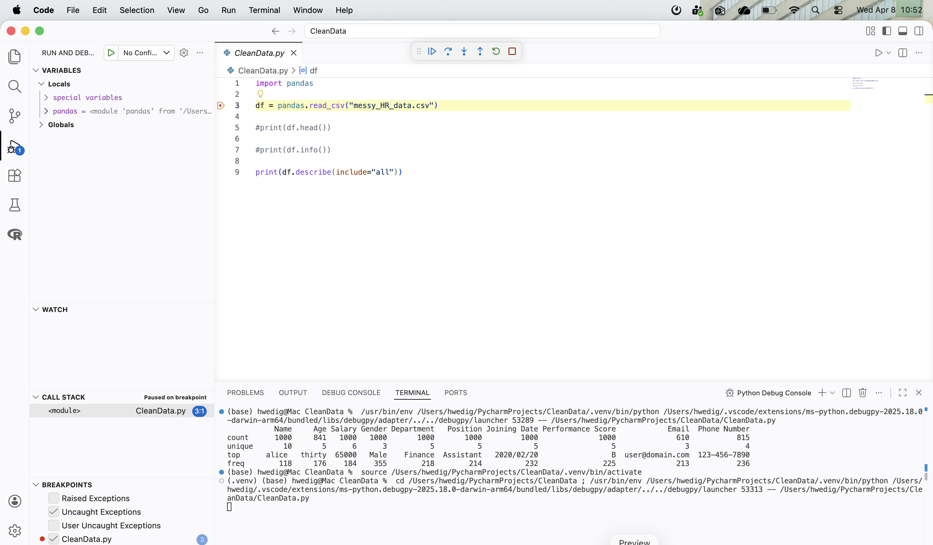 Once the debugging process begins, new windows will appear in your editor, providing insights into your code.