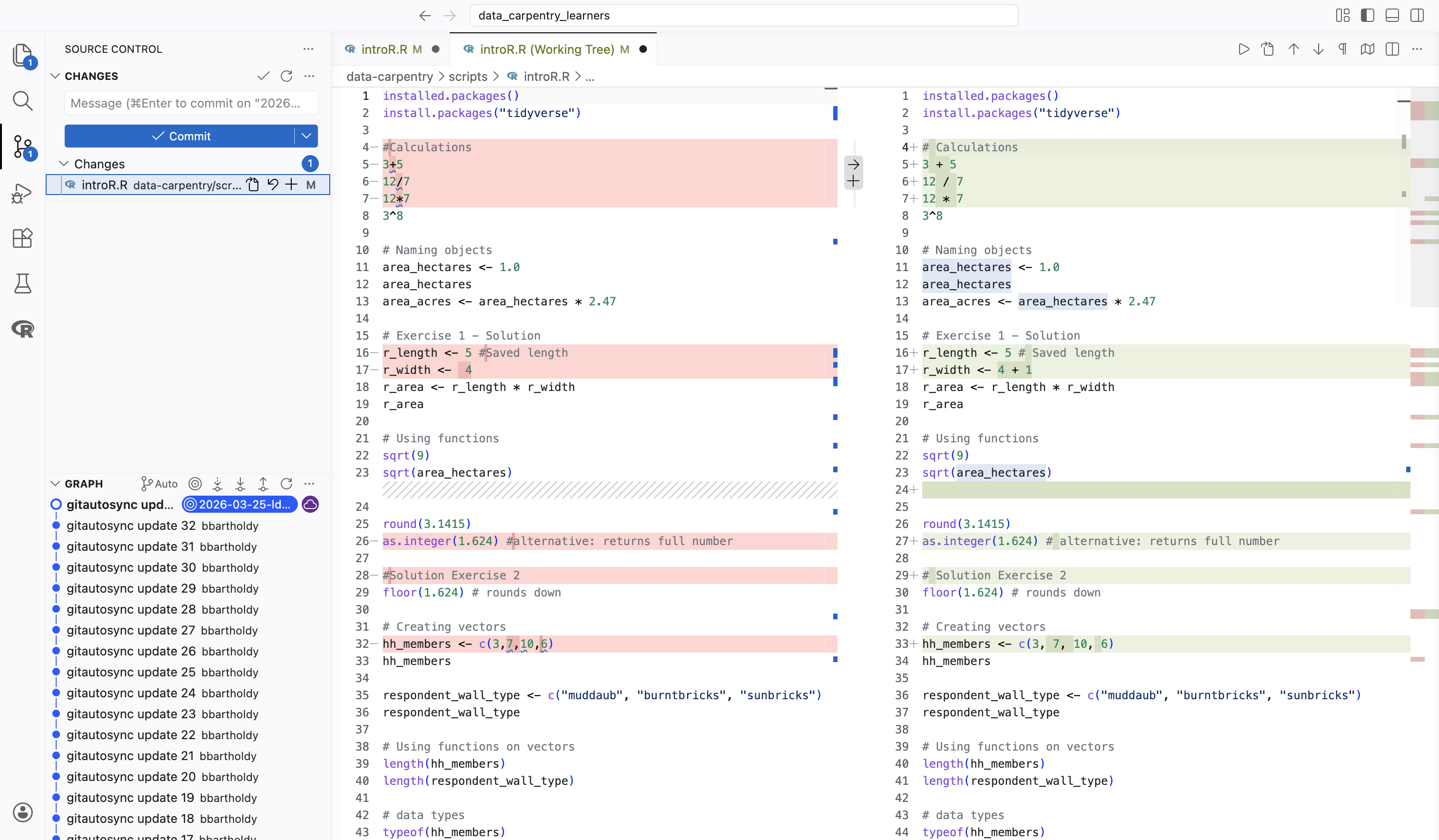 By clicking on the third button in the activity sidebar, you will see an overview of all changes and the history of your Git repository. Additionally, you can compare the current version with the uploaded version, as demonstrated in the example below.