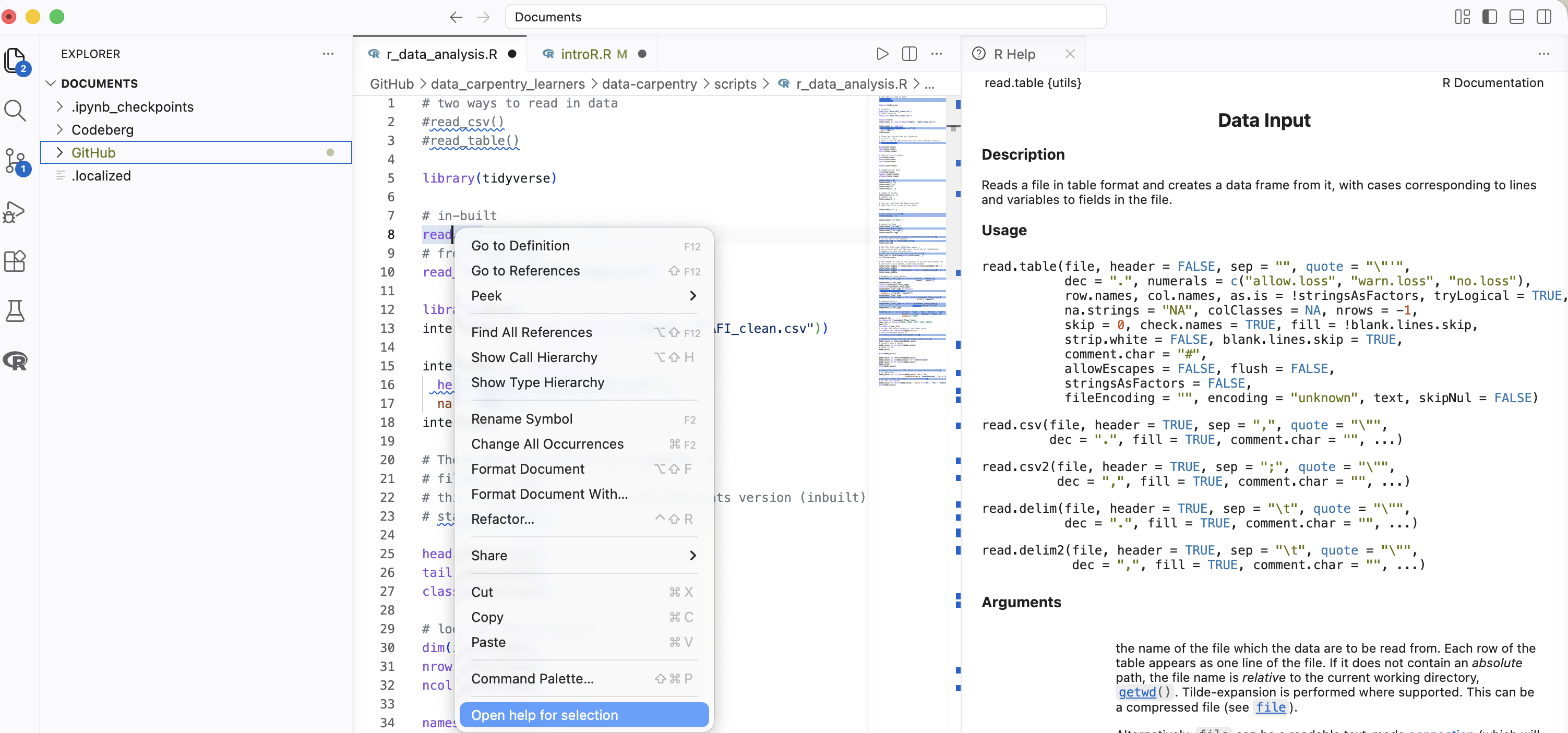 For R, you can also open the specific help for a selection with the help of the contextual edit menu and a click on Open help for selection.