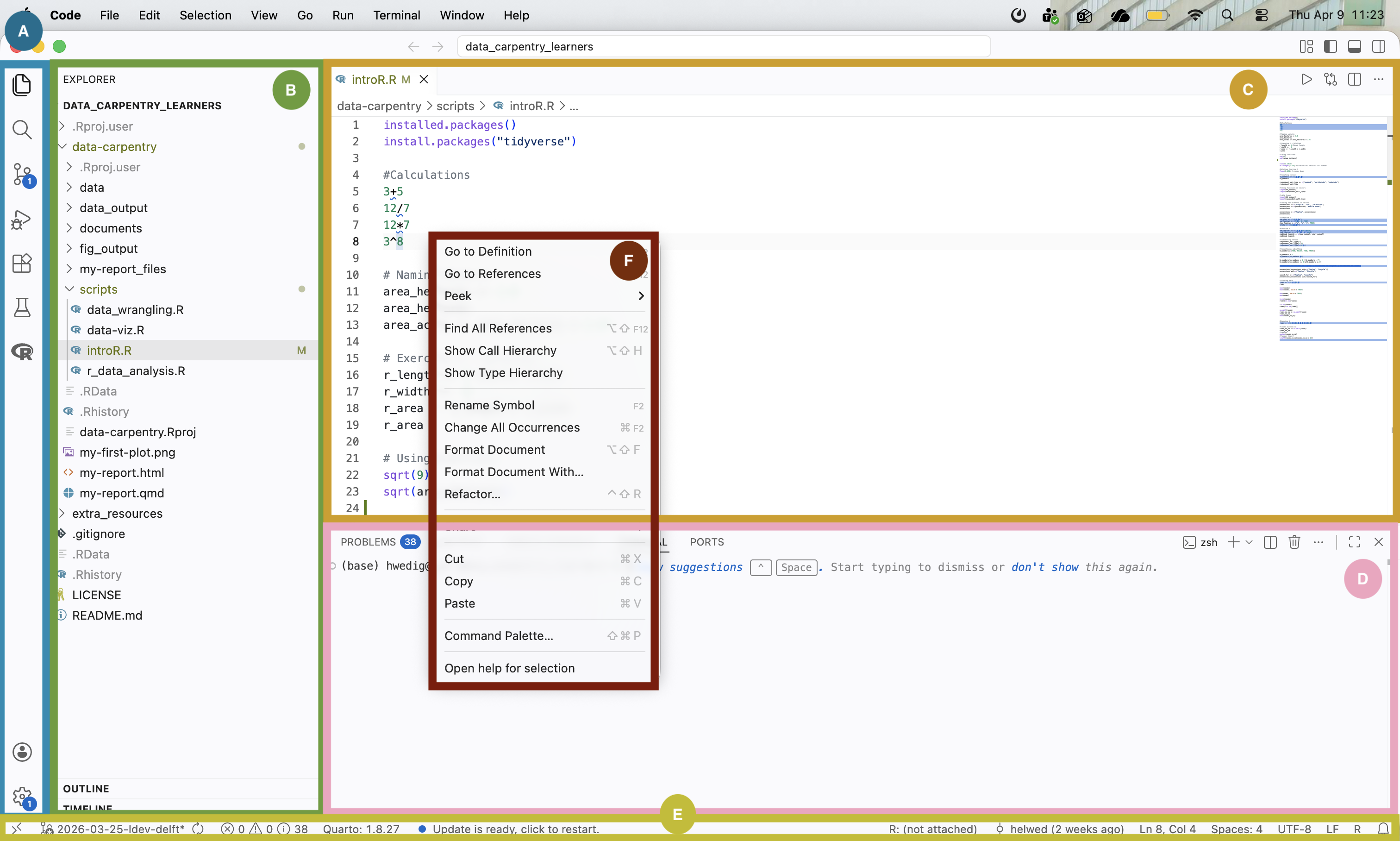 - Activity Bar (A): this bar on the left gives you fast access to context-specific indicators, e.g., Git, run your code, search for files and look for extensions.